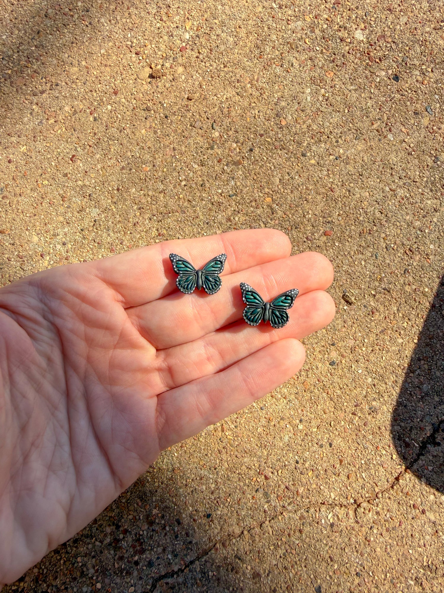 These black butterfly stud earrings feature layered darker green and hunter green-blue accents for a rich, dimensional look. The sculpted wing detailing adds depth and texture, creating a bold yet wearable nature-inspired design.