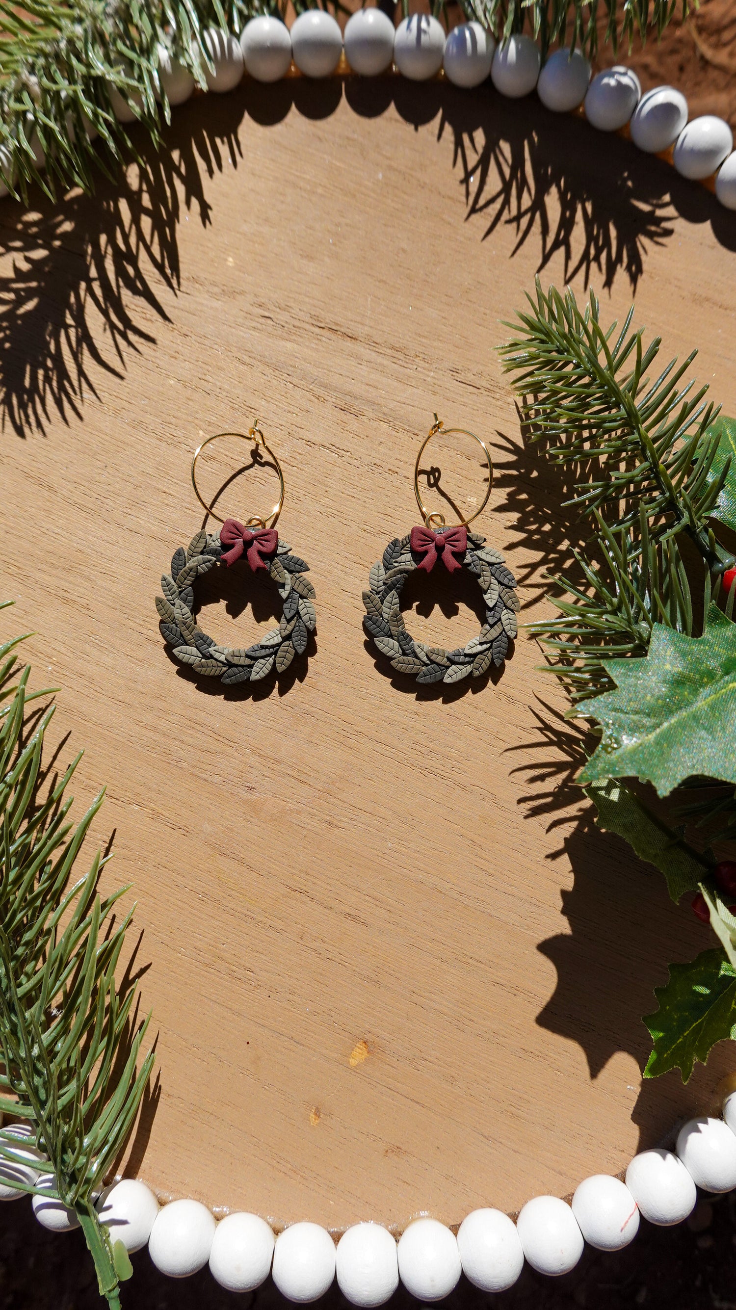Celebrate the season with a touch of handmade charm. These Evergreen Wreath Earrings are crafted from polymer clay and shaped into delicate leaf wreaths, finished with a soft maroon bow. Subtle, festive, and elegant — they’re perfect for holiday gatherings, winter weddings, or cozy everyday wear.