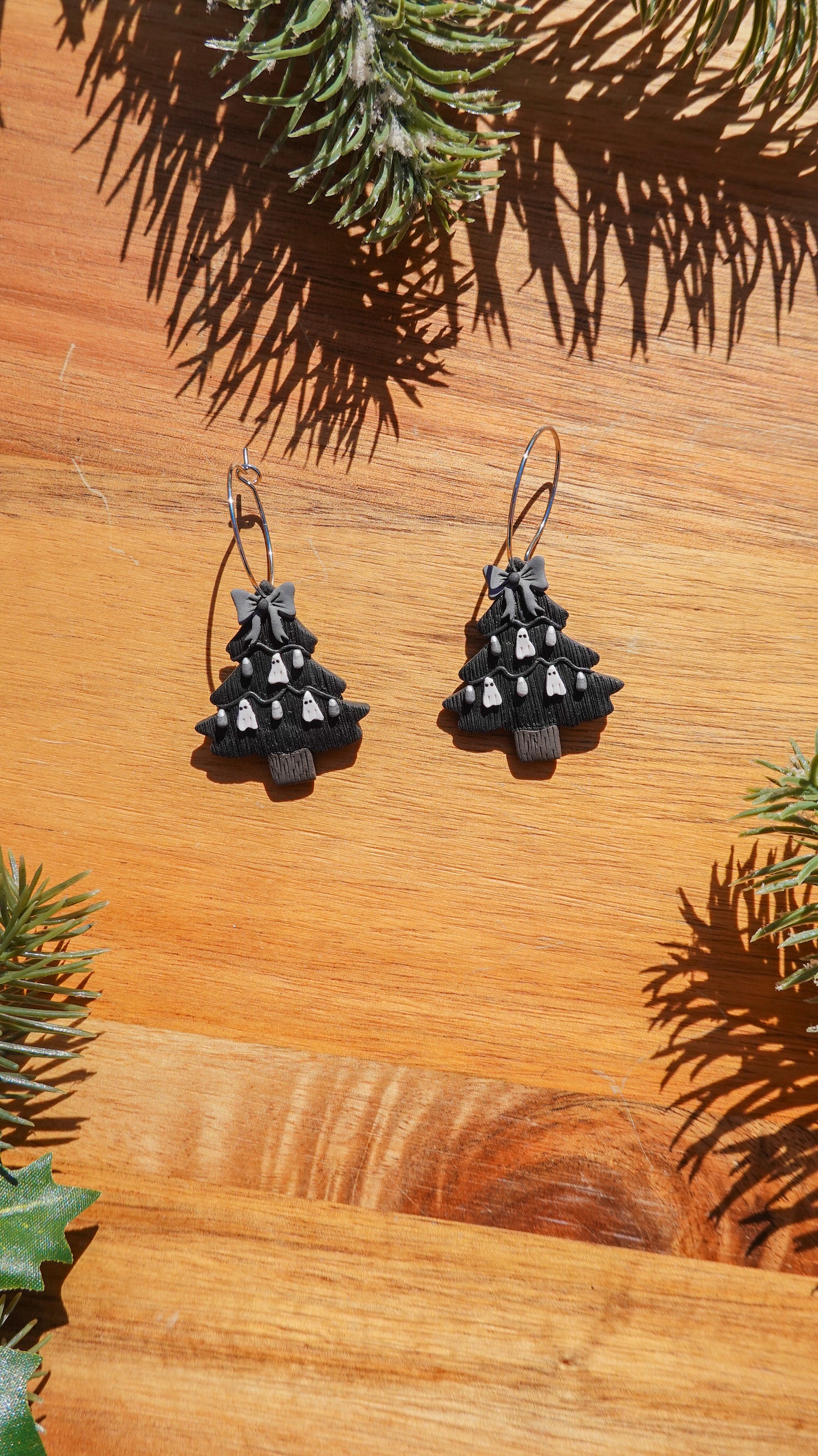 When spooky season meets holiday cheer! These handcrafted polymer clay earrings feature miniature black Christmas trees adorned with tiny ghost ornaments and twinkling “lights.” Perfect for those who can’t choose between Halloween and Christmas — or just love a touch of gothic holiday magic.