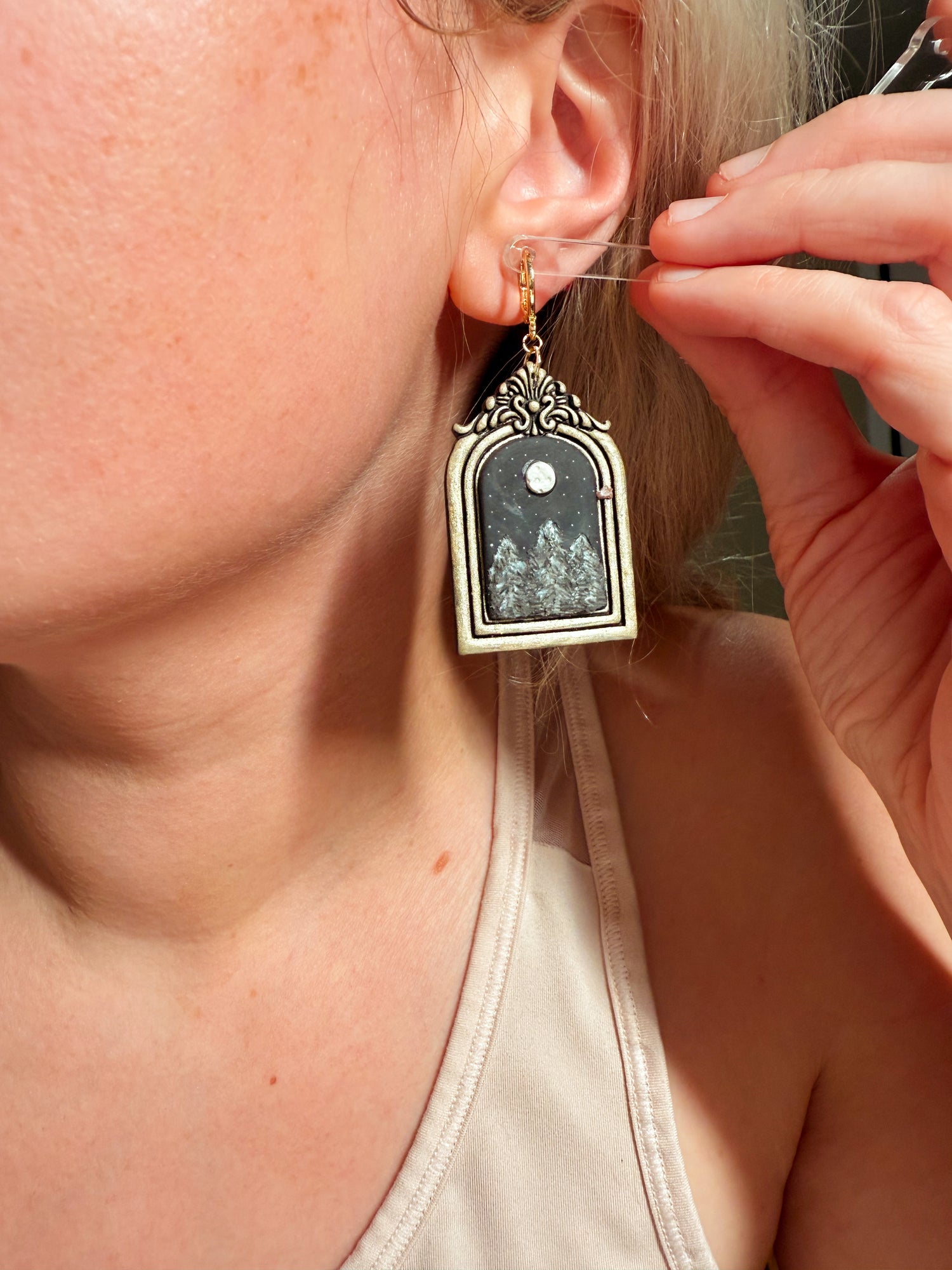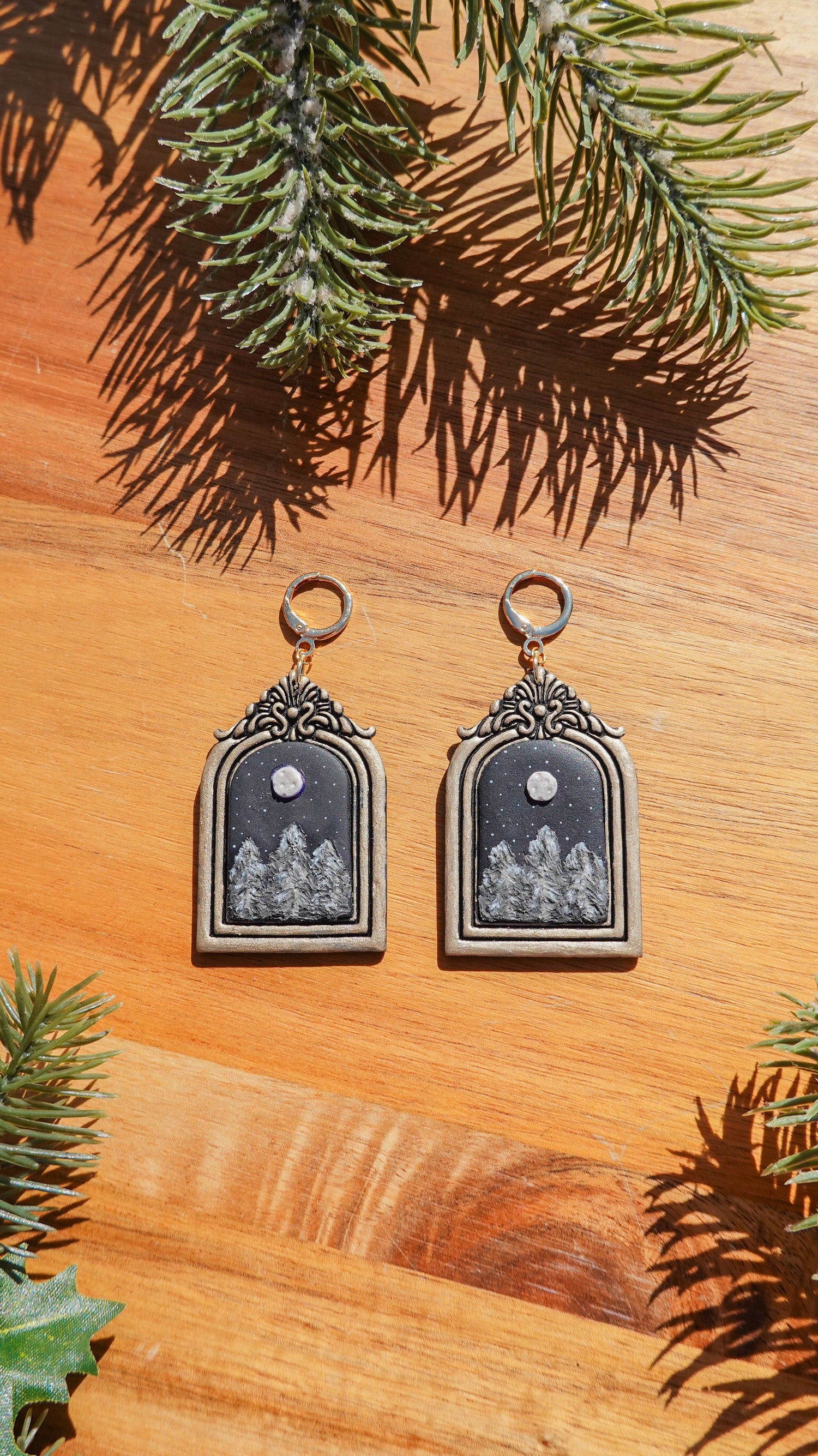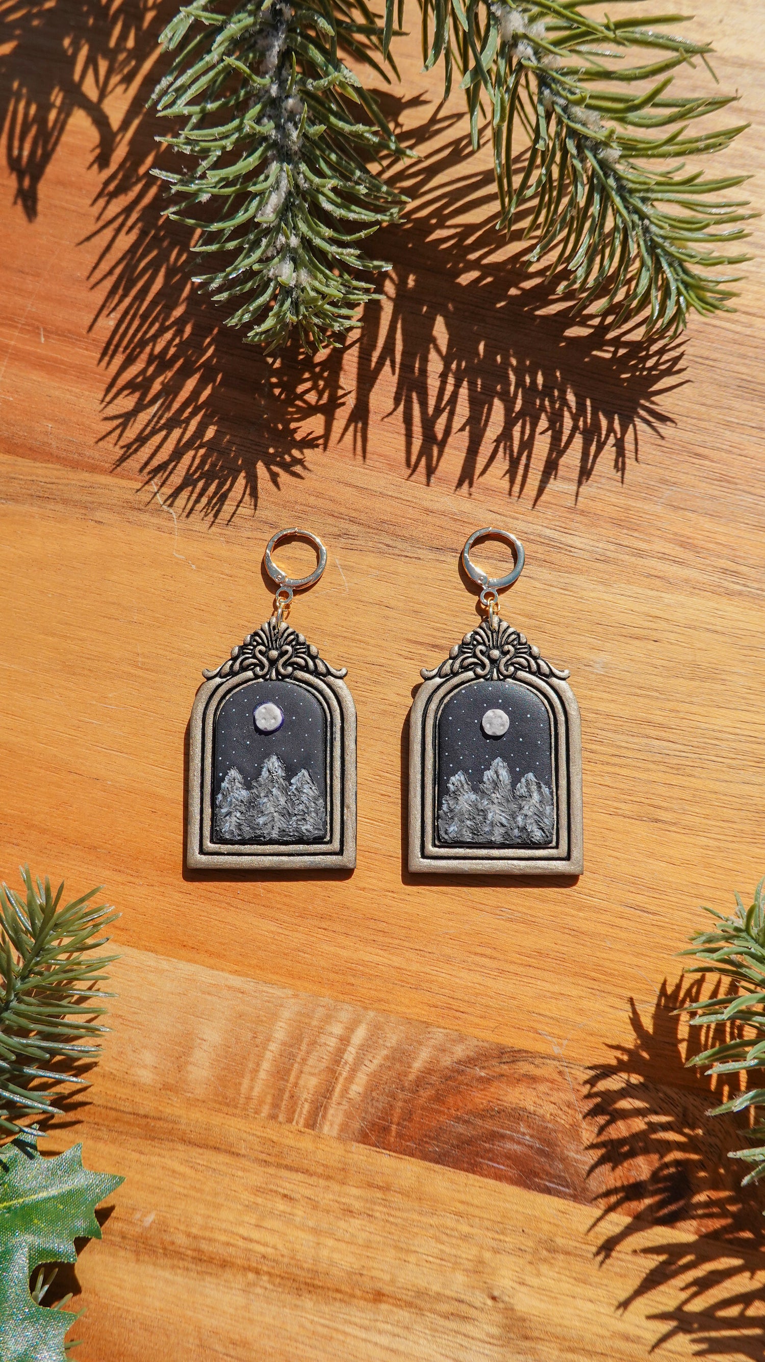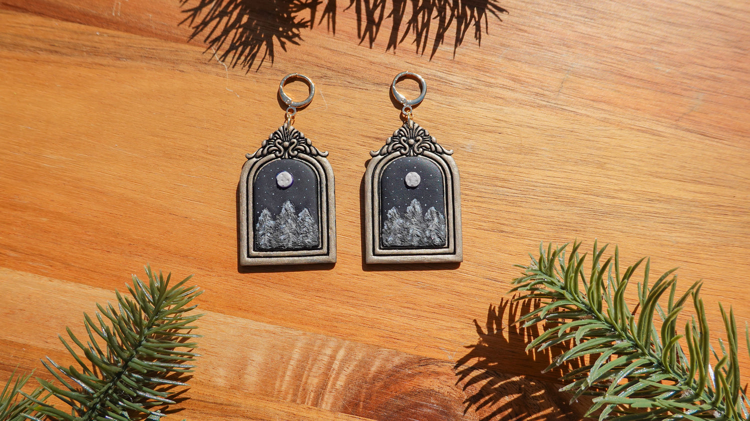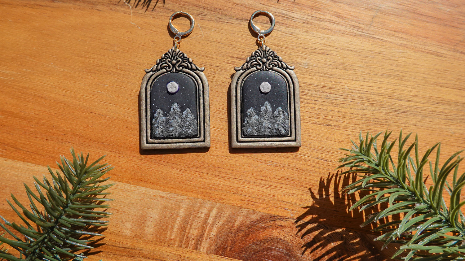 Bring the quiet beauty of the night sky wherever you go. This handcrafted clay pendant captures a peaceful mountain landscape beneath a glowing moon, framed in an ornate antique-style setting. Each piece is sculpted and painted by hand, evoking the calm and mystery of nature after dark.