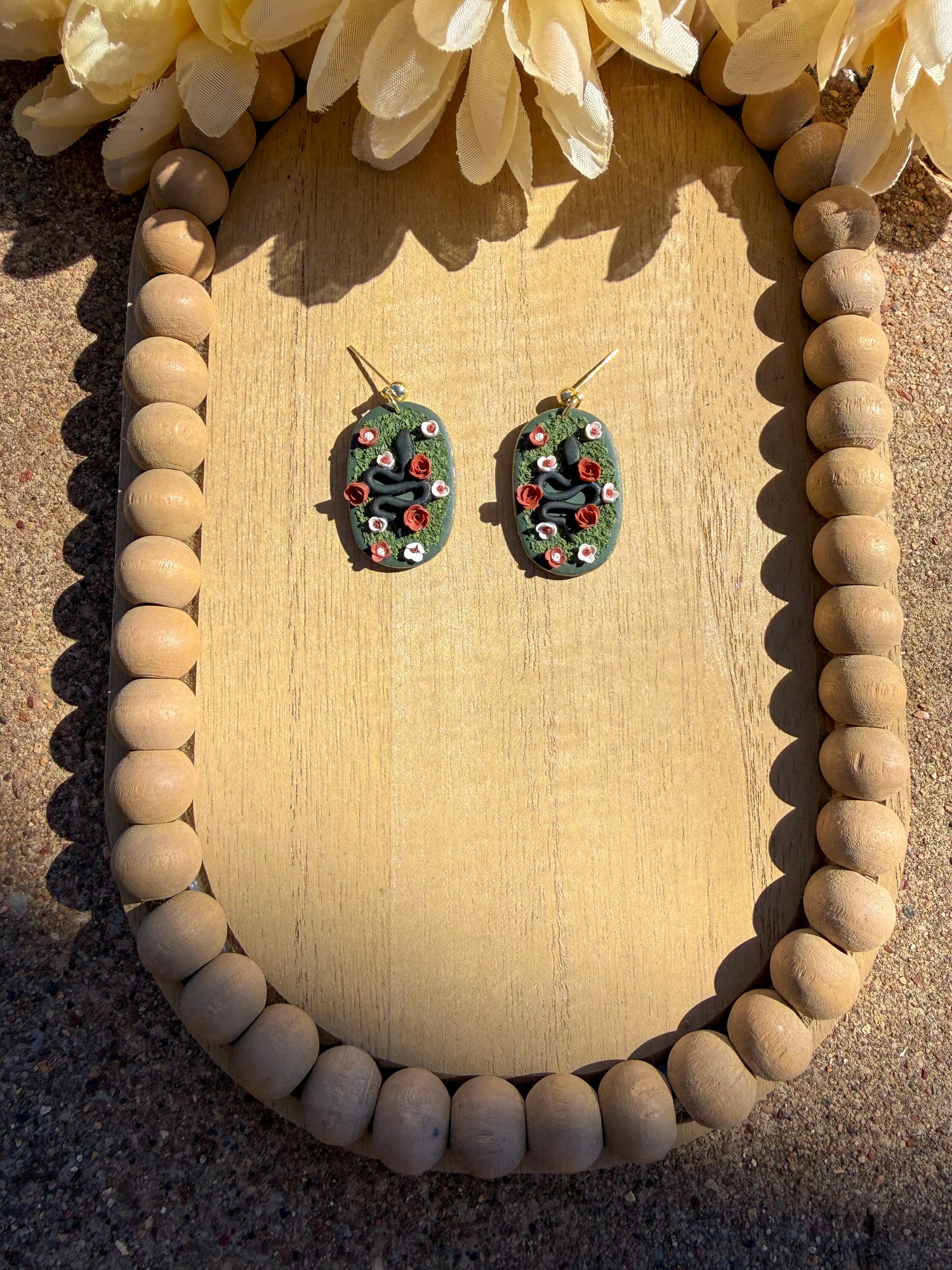 These forest green snake and rose polymer clay earrings combine dark symbolism with earthy floral tones. A sculpted serpent winds across a deep green background, surrounded by raised off-white and warm brown-orange roses for a rich, dimensional look.