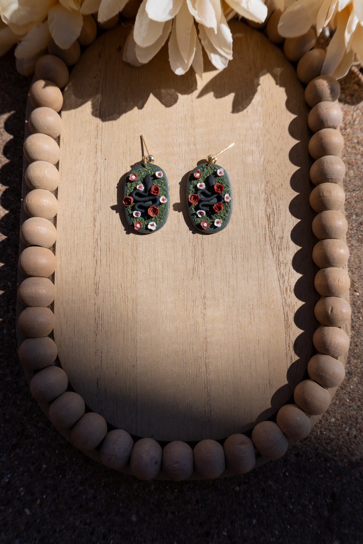 snake earrings, serpent jewelry, rose earrings, neutral floral earrings, gothic jewelry, woodland accessories, forest green earrings, earthy statement earrings, alternative fashion jewelry, botanical polymer clay earrings